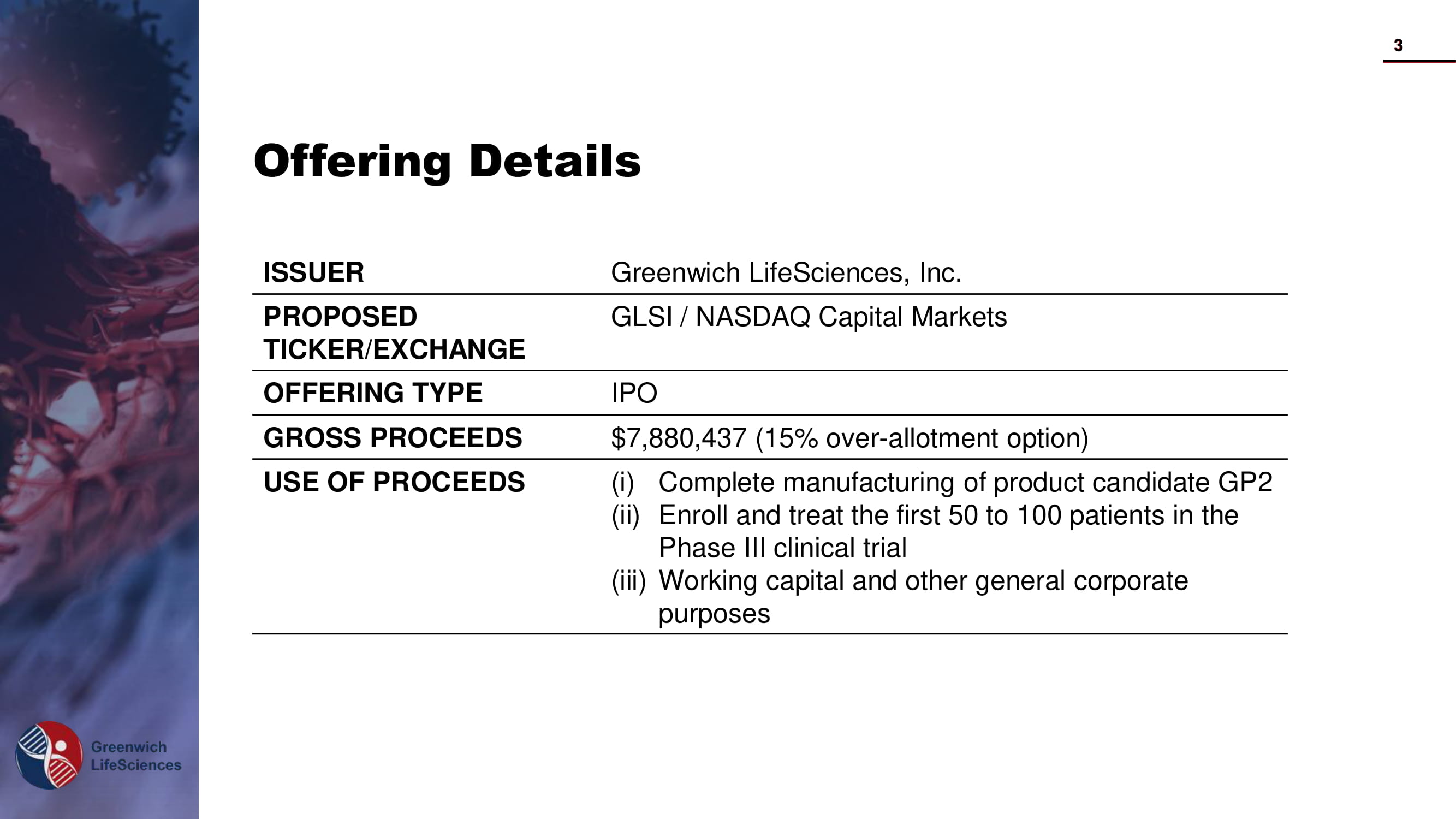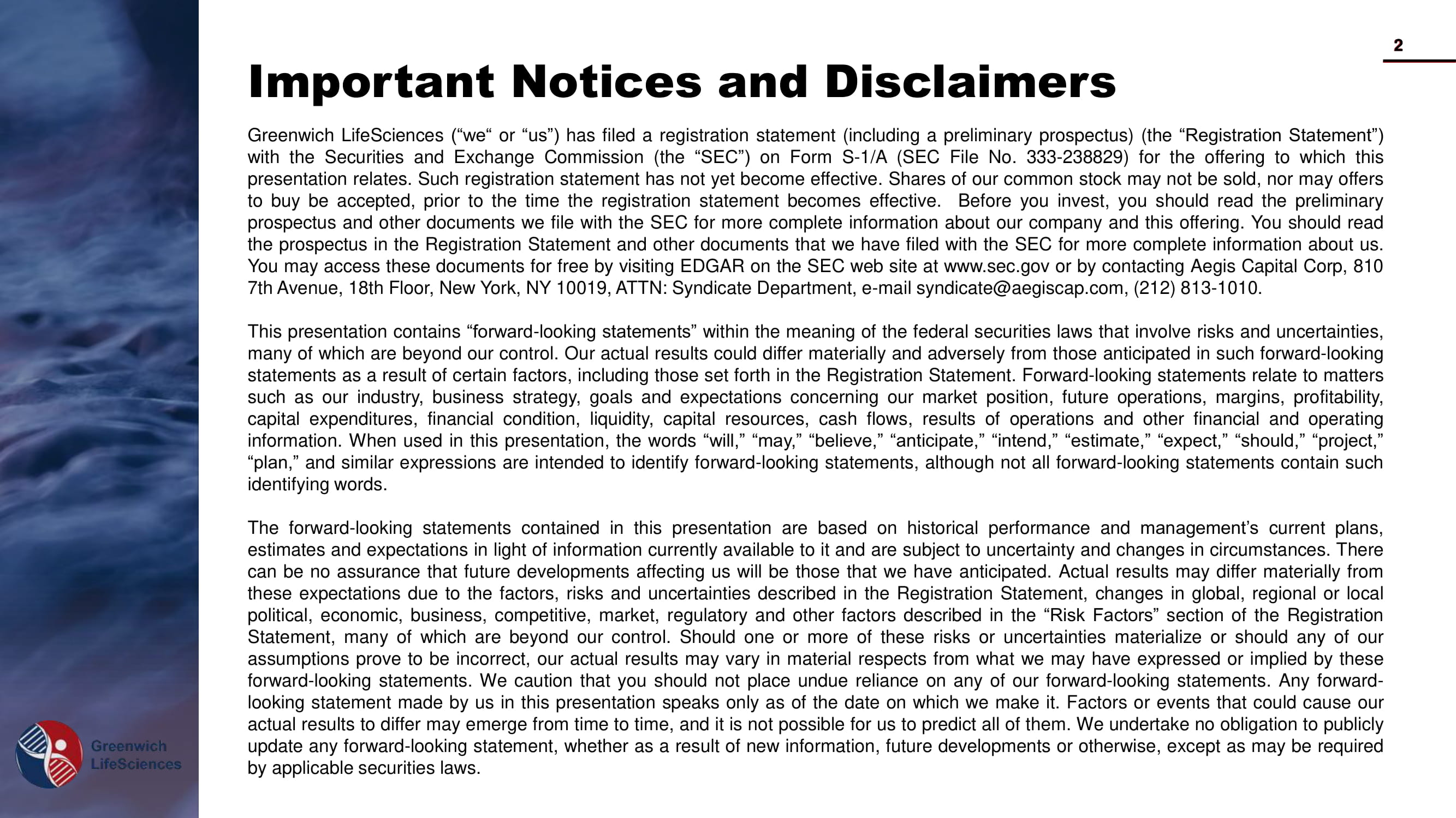 Greenwich LifeSciences (“we“ or “us”) has filed a registration statement (including a preliminary prospectus) (the “Registration Statement”) with the Securities and Exchange Commission (the “SEC”) on Form S - 1 /A (SEC File No . 333 - 238829 ) for the offering to which this presentation relates . Such registration statement has not yet become effective . Shares of our common stock may not be sold, nor may offers to buy be accepted, prior to the time the registration statement becomes effective . Before you invest, you should read the preliminary prospectus and other documents we file with the SEC for more complete information about our company and this offering . You should read the prospectus in the Registration Statement and other documents that we have filed with the SEC for more complete information about us . You may access these documents for free by visiting EDGAR on the SEC web site at www . sec . gov or by contacting Aegis Capital Corp, 810 7 th Avenue, 18 th Floor, New York, NY 10019 , ATTN : Syndicate Department, e - mail syndicate@aegiscap . com, ( 212 ) 813 - 1010 . This presentation contains “forward - looking statements” within the meaning of the federal securities laws that involve risks and uncertainties, many of which are beyond our control . Our actual results could differ materially and adversely from those anticipated in such forward - looking statements as a result of certain factors, including those set forth in the Registration Statement . Forward - looking statements relate to matters such as our industry, business strategy, goals and expectations concerning our market position, future operations, margins, profitability, capital expenditures, financial condition, liquidity, capital resources, cash flows, results of operations and other financial and operating information . When used in this presentation, the words “will,” “may,” “believe,” “anticipate,” “intend,” “estimate,” “expect,” “should,” “project,” “plan,” and similar expressions are intended to identify forward - looking statements, although not all forward - looking statements contain such identifying words . The forward - looking statements contained in this presentation are based on historical performance and management’s current plans, estimates and expectations in light of information currently available to it and are subject to uncertainty and changes in circumstances . There can be no assurance that future developments affecting us will be those that we have anticipated . Actual results may differ materially from these expectations due to the factors, risks and uncertainties described in the Registration Statement, changes in global, regional or local political, economic, business, competitive, market, regulatory and other factors described in the “Risk Factors” section of the Registration Statement, many of which are beyond our control . Should one or more of these risks or uncertainties materialize or should any of our assumptions prove to be incorrect, our actual results may vary in material respects from what we may have expressed or implied by these forward - looking statements . We caution that you should not place undue reliance on any of our forward - looking statements . Any forward - looking statement made by us in this presentation speaks only as of the date on which we make it . Factors or events that could cause our actual results to differ may emerge from time to time, and it is not possible for us to predict all of them . We undertake no obligation to publicly update any forward - looking statement, whether as a result of new information, future developments or otherwise, except as may be required by applicable securities laws . Important Notices and Disclaimers 2