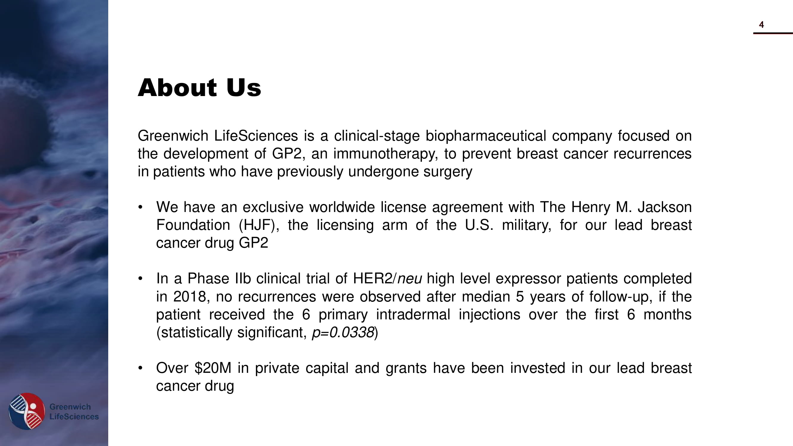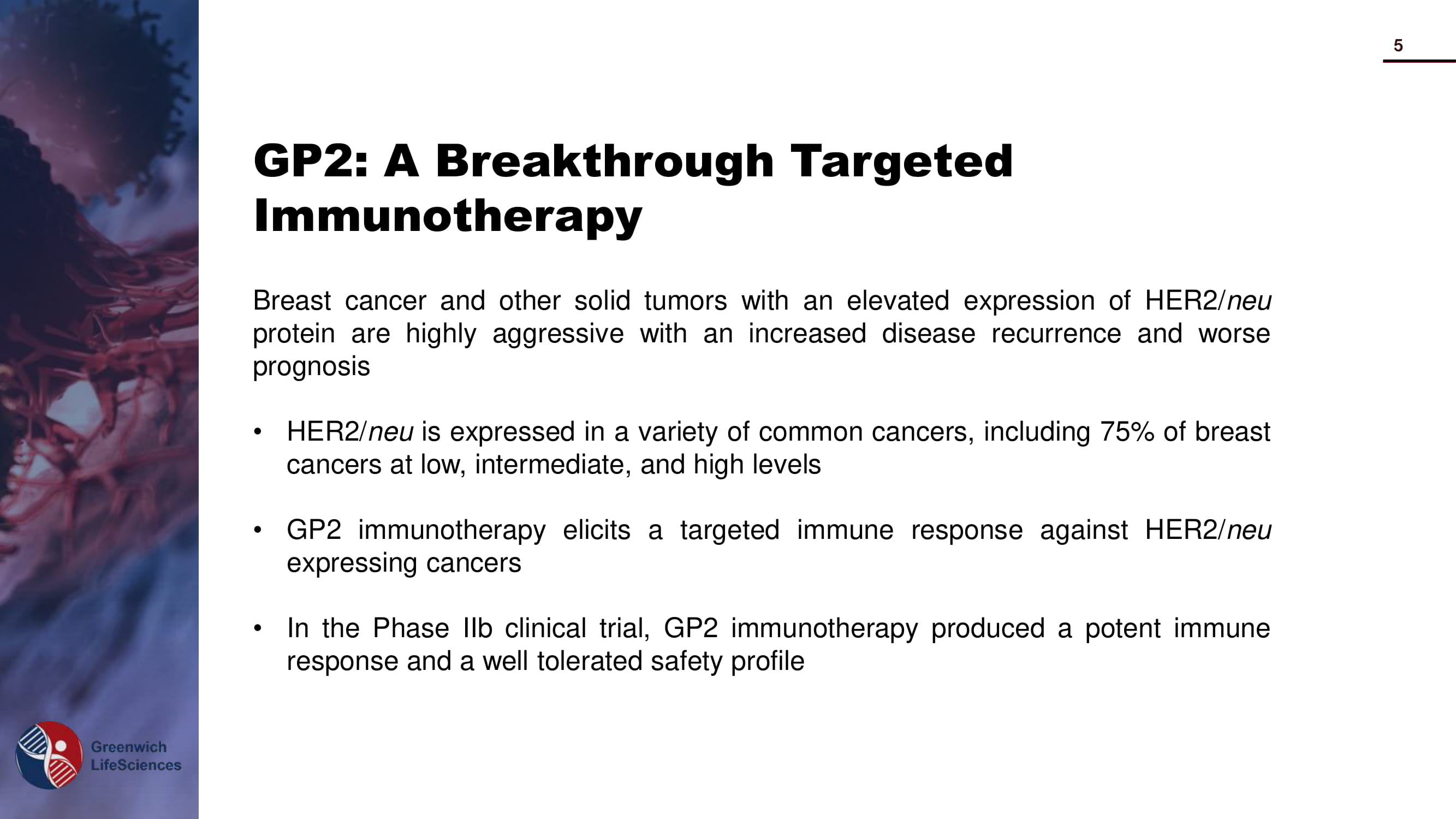 Greenwich LifeSciences is a clinical - stage biopharmaceutical company focused on the development of GP 2 , an immunotherapy, to prevent breast cancer recurrences in patients who have previously undergone surgery • We have an exclusive worldwide license agreement with The Henry M . Jackson Foundation (HJF), the licensing arm of the U . S . military, for our lead breast cancer drug GP 2 • In a Phase IIb clinical trial of HER 2 / neu high level expressor patients completed in 2018 , no recurrences were observed after median 5 years of follow - up, if the patient received the 6 primary intradermal injections over the first 6 months (statistically significant, p= 0 . 0338 ) • Over $ 20 M in private capital and grants have been invested in our lead breast cancer drug About Us 4