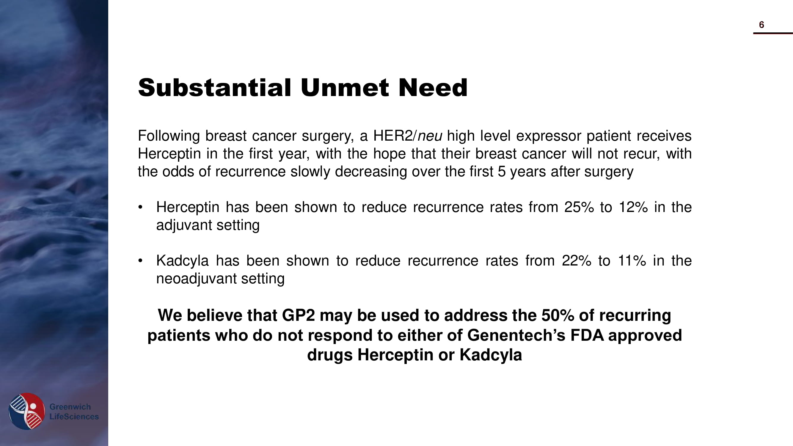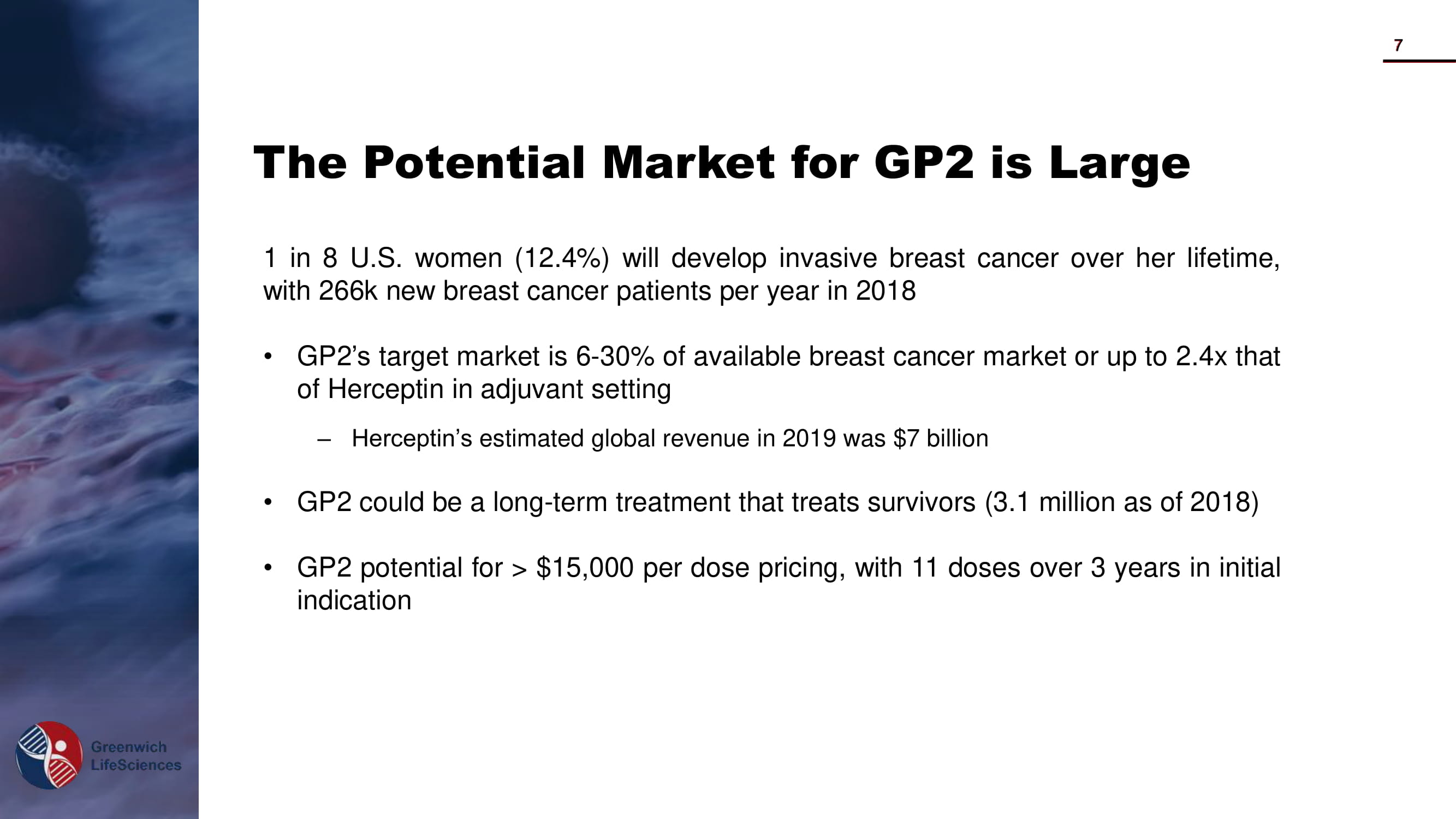 Following breast cancer surgery, a HER 2 / neu high level expressor patient receives Herceptin in the first year, with the hope that their breast cancer will not recur, with the odds of recurrence slowly decreasing over the first 5 years after surgery • Herceptin has been shown to reduce recurrence rates from 25 % to 12 % in the adjuvant setting • Kadcyla has been shown to reduce recurrence rates from 22 % to 11 % in the neoadjuvant setting We believe that GP2 may be used to address the 50% of recurring patients who do not respond to either of Genentech’s FDA approved drugs Herceptin or Kadcyla Substantial Unmet Need 6