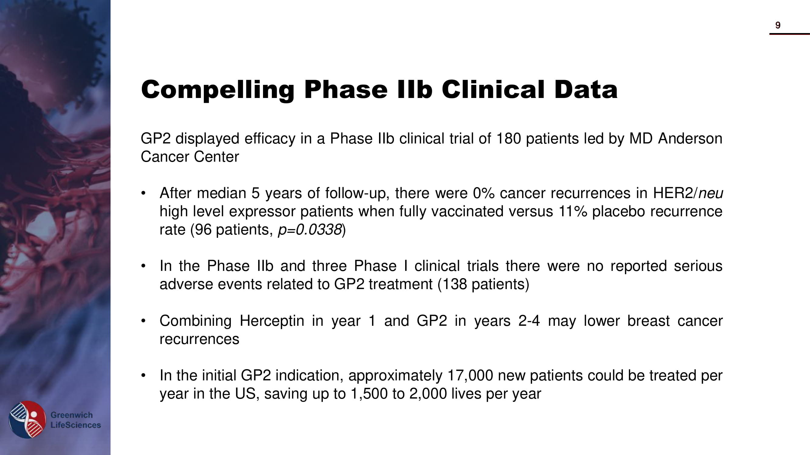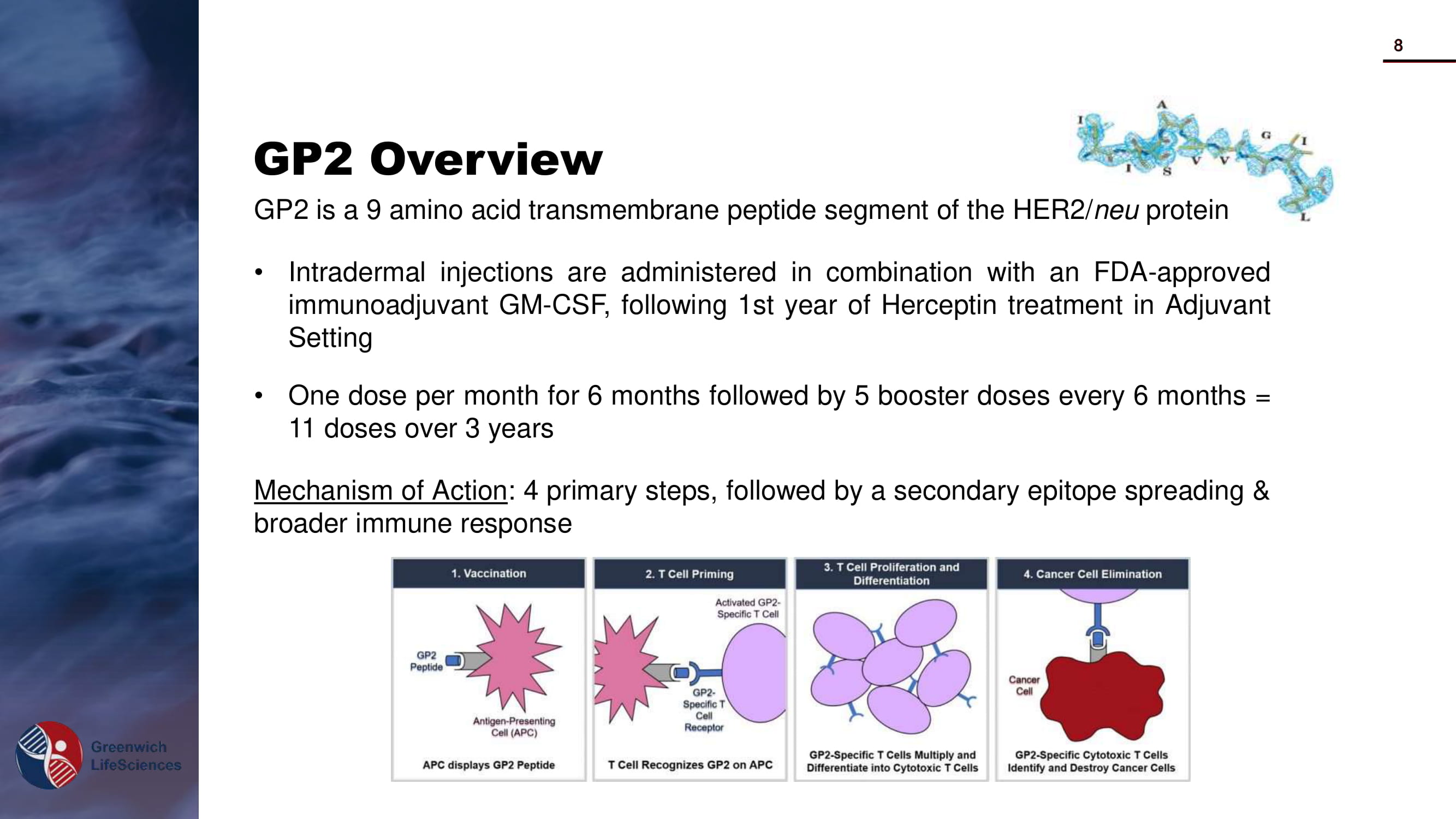 GP2 Overview GP 2 is a 9 amino acid transmembrane peptide segment of the HER 2 / neu protein • Intradermal injections are administered in combination with an FDA - approved immunoadjuvant GM - CSF, following 1 st year of Herceptin treatment in Adjuvant Setting • One dose per month for 6 months followed by 5 booster doses every 6 months = 11 doses over 3 years Mechanism of Action : 4 primary steps, followed by a secondary epitope spreading & broader immune response 8
