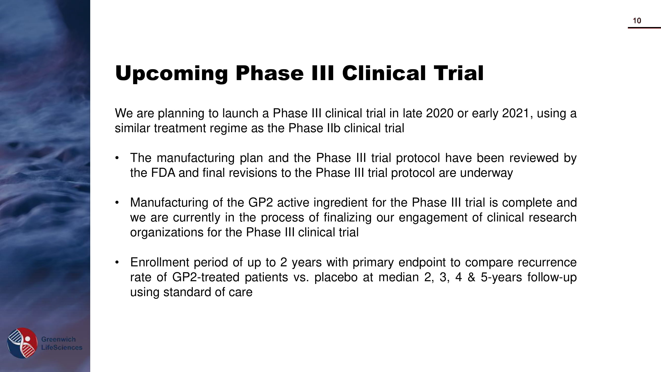 We are planning to launch a Phase III clinical trial in late 2020 or early 2021 , using a similar treatment regime as the Phase IIb clinical trial • The manufacturing plan and the Phase III trial protocol have been reviewed by the FDA and final revisions to the Phase III trial protocol are underway • Manufacturing of the GP 2 active ingredient for the Phase III trial is complete and we are currently in the process of finalizing our engagement of clinical research organizations for the Phase III clinical trial • Enrollment period of up to 2 years with primary endpoint to compare recurrence rate of GP 2 - treated patients vs . placebo at median 2 , 3 , 4 & 5 - years follow - up using standard of care Upcoming Phase III Clinical Trial 10