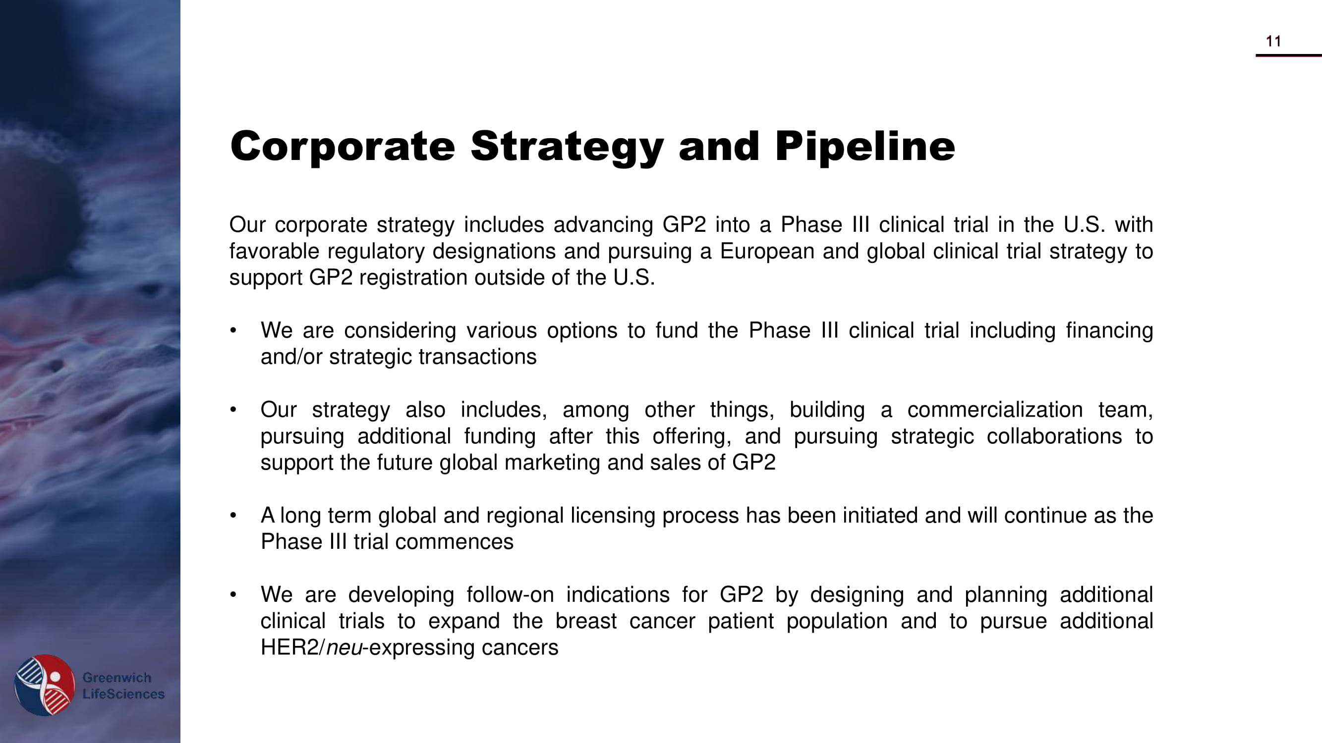 Our corporate strategy includes advancing GP 2 into a Phase III clinical trial in the U . S . with favorable regulatory designations and pursuing a European and global clinical trial strategy to support GP 2 registration outside of the U . S . • We are considering various options to fund the Phase III clinical trial including financing and/or strategic transactions • Our strategy also includes, among other things, building a commercialization team, pursuing additional funding after this offering, and pursuing strategic collaborations to support the future global marketing and sales of GP 2 • A long term global and regional licensing process has been initiated and will continue as the Phase III trial commences • We are developing follow - on indications for GP 2 by designing and planning additional clinical trials to expand the breast cancer patient population and to pursue additional HER 2 / neu - expressing cancers Corporate Strategy and Pipeline 11