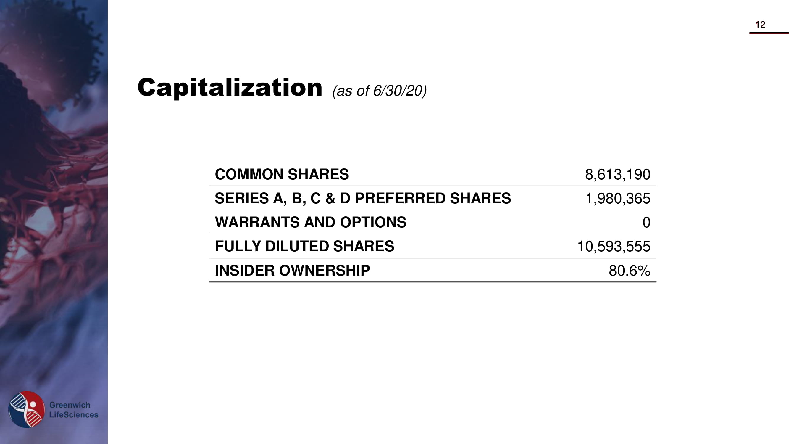 Capitalization (as of 6/30/20) COMMON SHARES 8,613,190 SERIES A, B, C & D PREFERRED SHARES 1,980,365 WARRANTS AND OPTIONS 0 FULLY DILUTED SHARES 10,593,555 INSIDER OWNERSHIP 80.6% 12