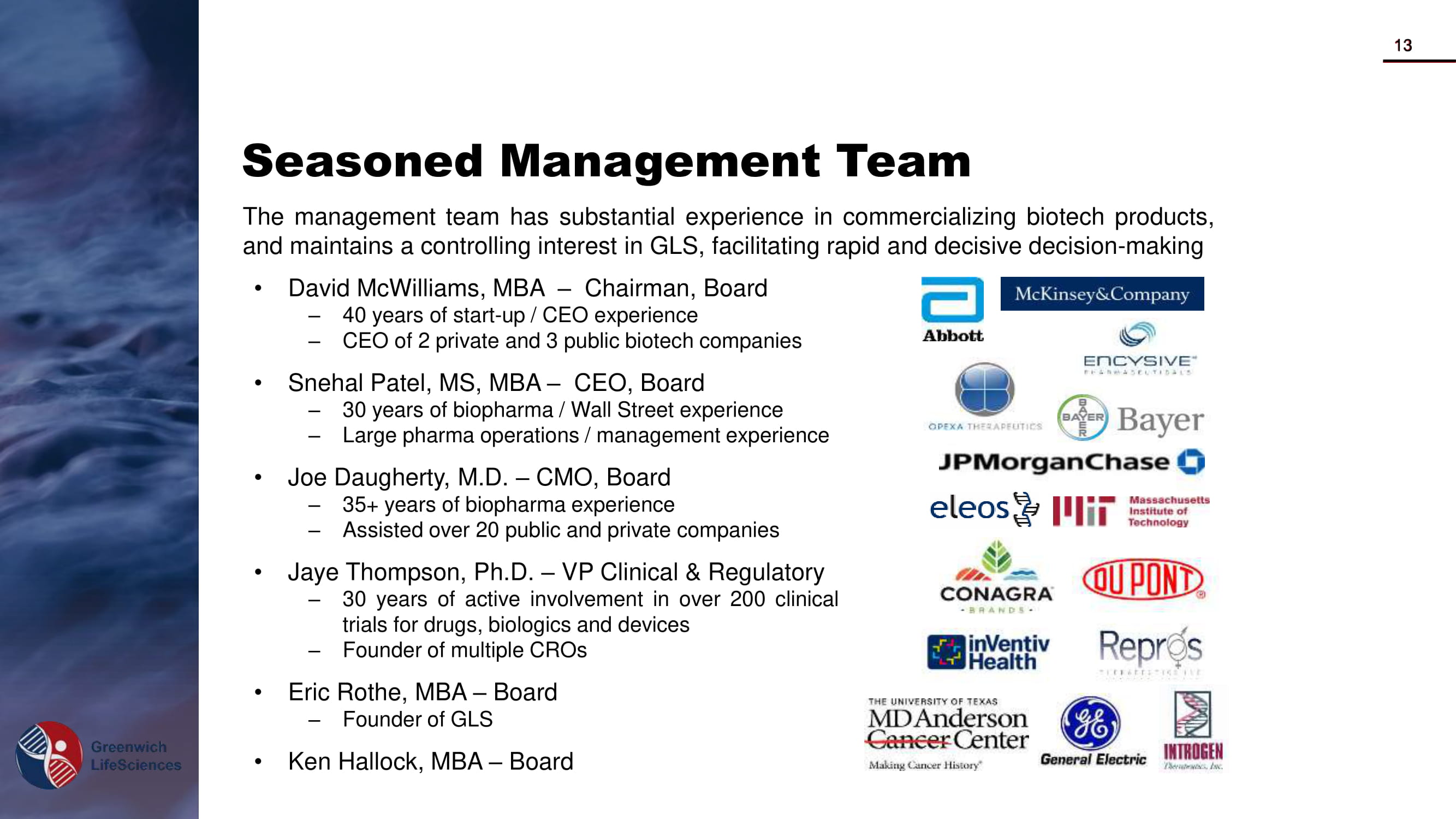 • David McWilliams, MBA – Chairman, Board ‒ 40 years of start - up / CEO experience ‒ CEO of 2 private and 3 public biotech companies • Snehal Patel, MS, MBA – CEO, Board ‒ 30 years of biopharma / Wall Street experience ‒ Large pharma operations / management experience • Joe Daugherty, M . D . – CMO, Board ‒ 35 + years of biopharma experience ‒ Assisted over 20 public and private companies • Jaye Thompson, Ph . D . – VP Clinical & Regulatory ‒ 30 years of active involvement in over 200 clinical trials for drugs, biologics and devices ‒ Founder of multiple CROs • Eric Rothe, MBA – Board ‒ Founder of GLS • Ken Hallock, MBA – Board Seasoned Management Team The management team has substantial experience in commercializing biotech products, and maintains a controlling interest in GLS, facilitating rapid and decisive decision - making 13