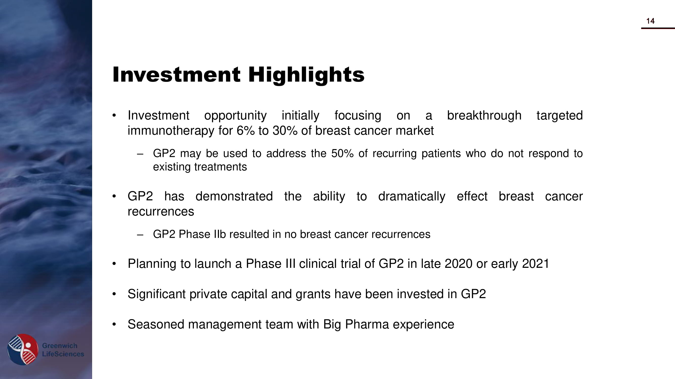 • Investment opportunity initially focusing on a breakthrough targeted immunotherapy for 6 % to 30 % of breast cancer market ‒ GP 2 may be used to address the 50 % of recurring patients who do not respond to existing treatments • GP 2 has demonstrated the ability to dramatically effect breast cancer recurrences ‒ GP 2 Phase IIb resulted in no breast cancer recurrences • Planning to launch a Phase III clinical trial of GP 2 in late 2020 or early 2021 • Significant private capital and grants have been invested in GP 2 • Seasoned management team with Big Pharma experience Investment Highlights 14