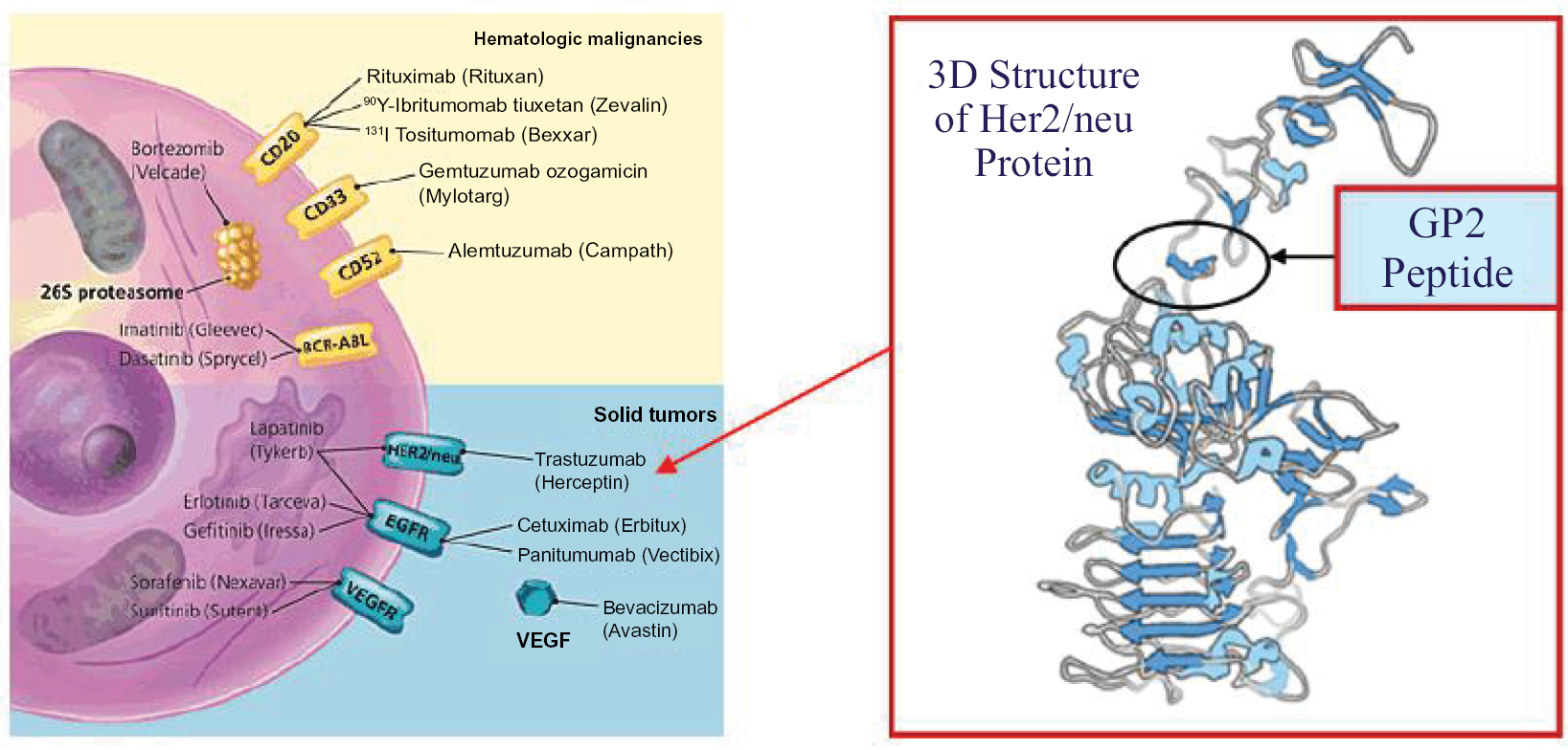 GP2 is a HER2/neu transmembrane peptide that elicits a targeted immune response against HER2/neu-expressing cancers. Below is an image of a cell surface showing therapeutically relevant cell surface proteins in cancer. Breast cancers and other solid tumors with elevated expression of HER2/neu protein are highly aggressive with an increased disease recurrence and a worse prognosis.