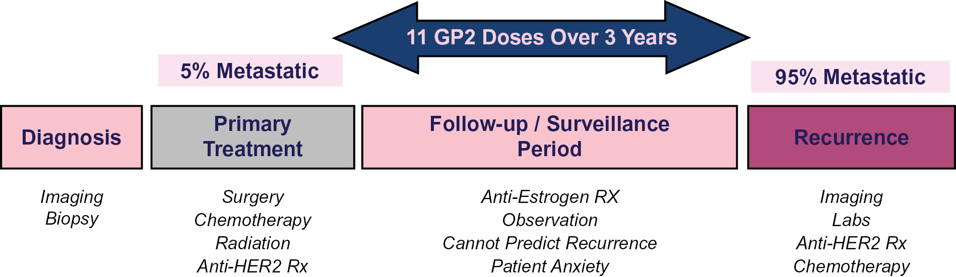 Following breast cancer surgery, a HER2/neu 3+ patient receives Herceptin in the first year, with the hope that their breast cancer will not recur, with the odds of recurrence slowly decreasing over the first 5 years after surgery. Herceptin has been shown to reduce recurrence rates from 25% to 12% in the adjuvant setting while Kadcyla has been shown to reduce recurrence rates from 22% to 11% in the neoadjuvant setting. Accordingly, we believe that GP2 may be used to address the 50% of recurring patients who do not respond to either Herceptin or Kadcyla. In the neoadjuvant setting, a patient receives treatment before surgery and, based on the results of a biopsy at surgery, will receive the same or more potent treatment after surgery.