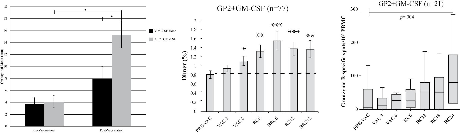 In the Phase IIb clinical trial, GP2 immunotherapy elicited a potent immune response in HLA-A02 patients after they received the 6 primary intradermal injections over the first 6 months. The immune response was measured by a local skin test and immunological assays. Further, booster injections given every 6 months thereafter prolonged the immune response, thereby providing longer term protection.