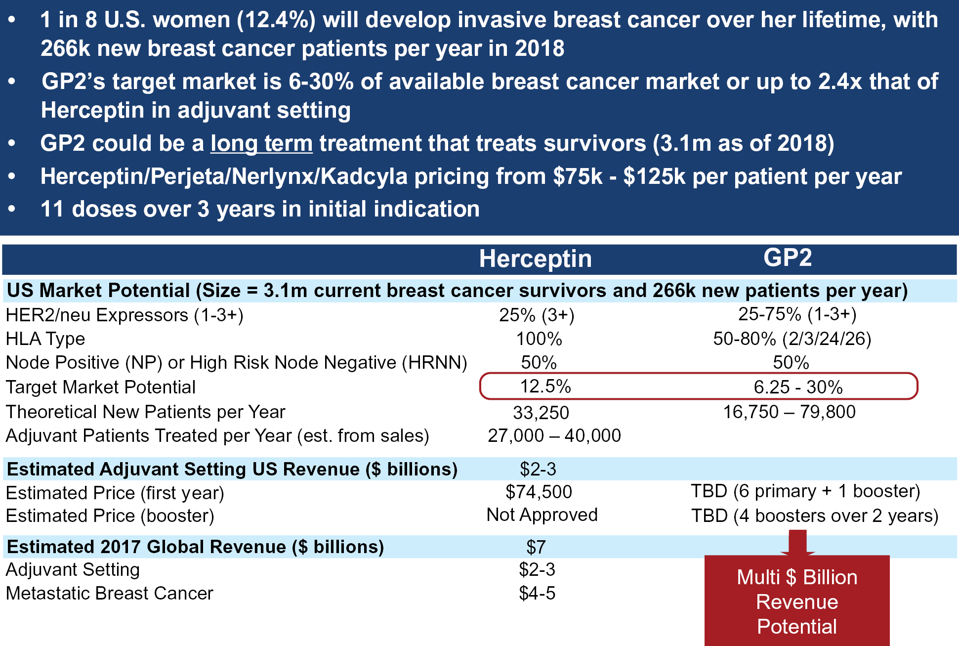 We believe that the potential market for the proposed initial and follow-on indications is large. HER2/neu 3+ breast cancer patients comprise approximately 25% of all breast cancer patients. Approximately 40% to 50% of the U.S. population contains the HLA-A02 allele, while node positive and high risk node negative patients comprise approximately 50% of the market. Therefore, we believe that the initial market for GP2 could be the combination of the three populations above which together comprises 6% of breast cancer patients. We believe that follow-on indications could include additional HLA types (an additional 30% of the U.S. population) and the low to intermediate expressors of HER2/neu 1-2+ patients (an additional 50% of all breast cancer patients) which would expand the GP2 market from our estimated initial 6% to 30% of breast cancer patients who undergo surgery. Thus the market for GP2, including follow-on indications, could be 2.4 times the current Herceptin adjuvant setting market, which constitutes approximately 12.5% of breast cancer patients.