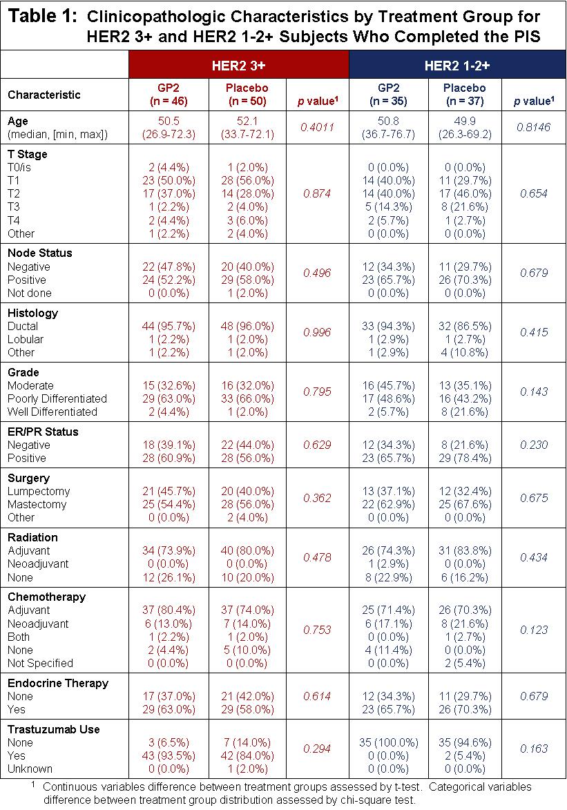 Figure 1 of the poster depicts evidence that disease free survival (“DFS”) is more likely in HER2 3+ GP2-treated subjects. After 5 years of follow-up, the Kaplan-Meier estimated 5-year DFS rate in the 46 HER2 3+ patients treated with GP2+GM-CSF, if the patient completed the PIS, was 100% versus 89.4% (95% CI:76.2, 95.5%) in the 50 placebo patients treated with GM-CSF (p = 0.0338). As shown in Table 1, the treated versus placebo HER2 3+ patients were well-matched, where approximately 53% were stage T1, 41% were stages T2-T4, 55% were node positive, 58% were hormone receptor positive and received endocrine therapy, 77% received adjuvant radiation, 77% received adjuvant chemotherapy, and 89% received trastuzumab.