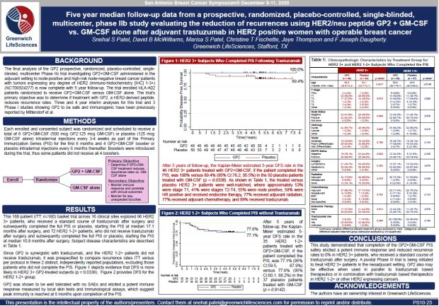 The median 5 year top-line data described below was presented at the San Antonio Breast Cancer Symposium in a poster on December 9, 2020, entitled “Five year median follow-up data from a prospective, randomized, placebo-controlled, single-blinded, multicenter, Phase IIb study evaluating the reduction of recurrences using HER2/neu peptide GP2+GM-CSF vs. GM-CSF alone after adjuvant trastuzumab in HER2 positive women with operable breast cancer.”