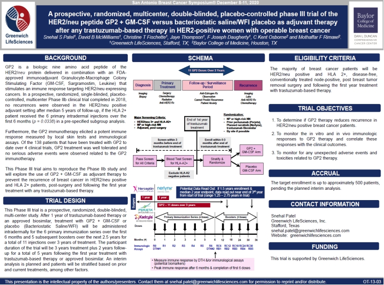 Poster OT-13-03 is entitled: A prospective, randomized, multicenter, double-blinded, placebo-controlled Phase III trial of the HER2/neu peptide GP2 + GM-CSF versus bacteriostatic saline/WFI placebo as adjuvant therapy after any trastuzumab-based therapy in HER2-positive women with operable breast cancer.
