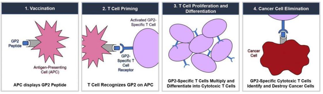 As shown below, following GP2 immunotherapy, CD8+ cytotoxic T lymphocytes (“CTLs”) recognize and destroy HER2/neu-expressing cancer cells. GP2 is administered in combination with an FDA-approved immunoadjuvant GM-CSF, which stimulates the proliferation of antigen presenting cells. Preclinical studies have shown that T cells sensitized against the GP2 peptide demonstrate significant recognition of HER2/neu-expressing tumors. Both ovarian and breast cancer-specific CTLs recognize GP2, which is widely expressed in HER2/neu-expressing tumors and is capable of inducing tumor-specific CTL populations in vitro.