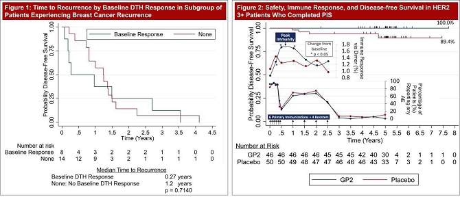 Figure 1 is the new data published yesterday evening at SABCS, which shows that GP2 immune response at baseline could be a prognosticator of cancer recurrence. The Phase IIb clinical trial enrolled HER2 positive patients, who received a standard course of trastuzumab after surgery, and HER2 low patients, who did not receive trastuzumab after surgery. A Delayed-Type Hypersensitivity (DTH) reaction was used to assess baseline in vivo immune responses to GP2 in patients prior to exposure to GP2 treatment or placebo.