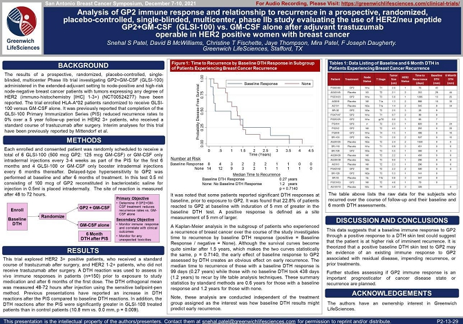 STAFFORD, Texas—(Business Wire)— Greenwich LifeSciences, Inc. (Nasdaq: GLSI) (the “Company”), a clinical-stage biopharmaceutical company focused on the development of GP2, an immunotherapy to prevent breast cancer recurrences in patients who have previously undergone surgery, today announced the publication of a poster for the GP2 Phase IIb clinical trial at the San Antonio Breast Cancer Symposium 2021 (SABCS). The CEO of Greenwich LifeSciences, Snehal Patel, recorded an audio track providing an overview. The abstract can be viewed at the bottom of this press release. The full poster with figures, tables, and audio can be accessed or downloaded from the Company’s website here.